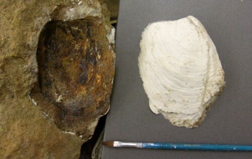 戸隠ではたくさんの種類の貝の化石が見つかっています。 ホタテの仲間やカキの仲間、アワビや赤貝などなど、本当にさまざまです。その中には、博物館の30年以上の歴史の中で、 これまでたった1つしか見つかっていない巻貝の化石もあります。 しかも石に残る…